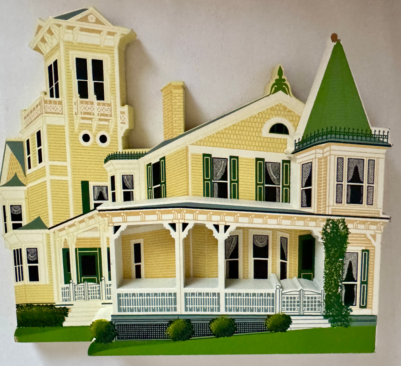 Each house is detailed to enhance the historic architecture using three-dimensional, dual-level construction. Each house is made of solid wood construction with screen printing and hand-painted shrubbery,
